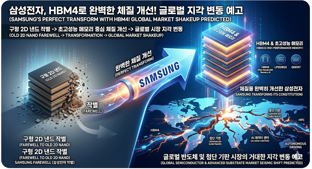 구형 2D 낸드와 작별하고 HBM4 등 초고성능 메모리로 체질을 완벽히 개선한 삼성전자, 글로벌 반도체 및 첨단 기판 시장의 거대한 지각 변동을 예고하고 있습니다!