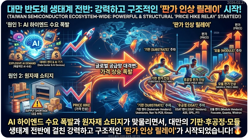 AI 하이엔드 수요 폭발과 원자재 쇼티지가 맞물리면서, 대만의 기판·후공정·모듈 생태계 전반에 걸친 강력하고 구조적인 '판가 인상 릴레이'가 시작되었습니다! 🔥