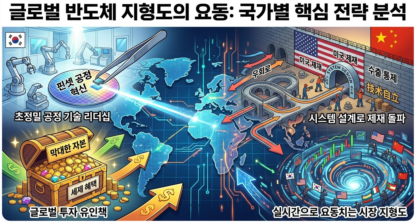 한국의 핀셋 공정 혁신, 인도의 막대한 자본과 세제 혜택 유혹, 그리고 미국의 제재를 '시스템 설계'라는 우회로로 뚫어내는 중국까지, 글로벌 반도체 시장의 지형도가 실시간으로 요동치고 있습니다!